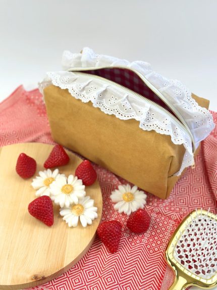 Túi mỹ phẩm giấy kraft bèo ren lót caro dâu 780,000 ₫