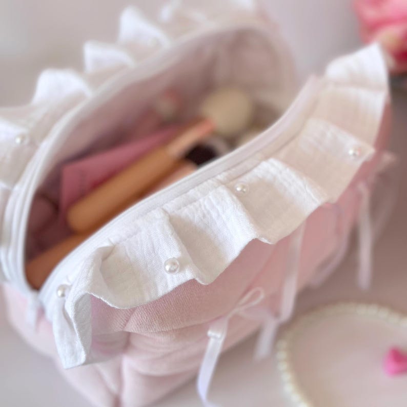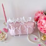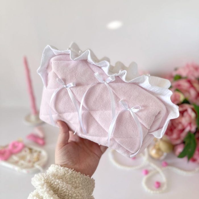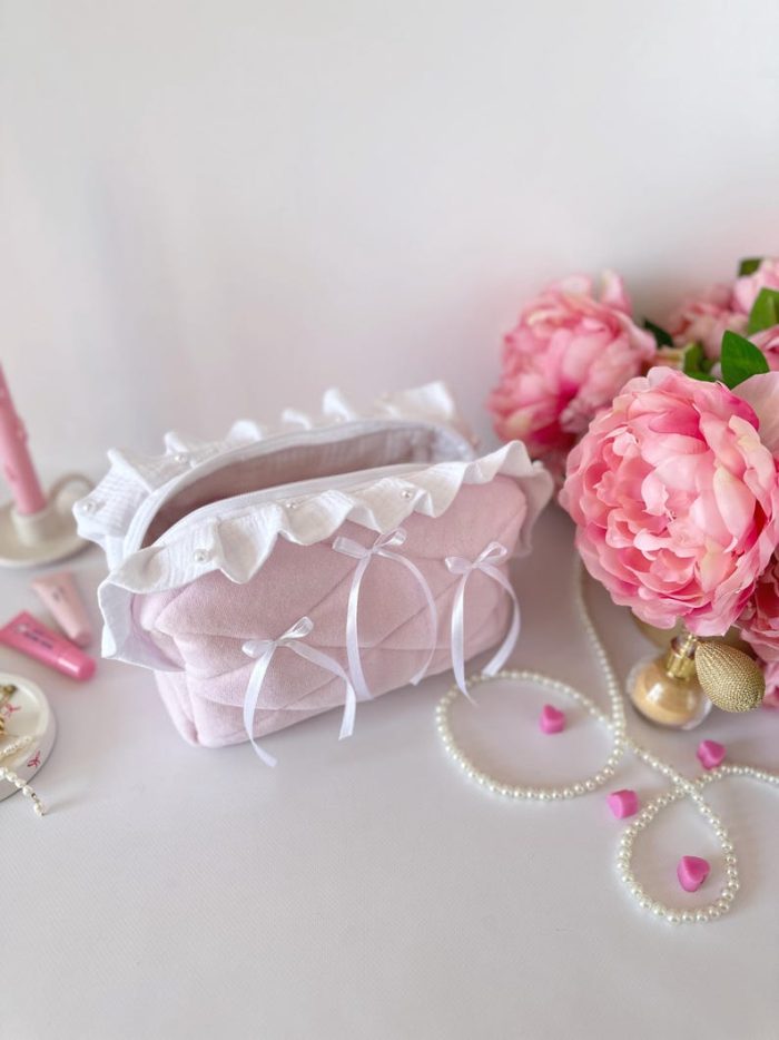 Túi mỹ phẩm hồng nơ bèo nhún