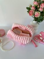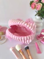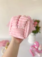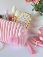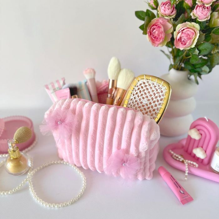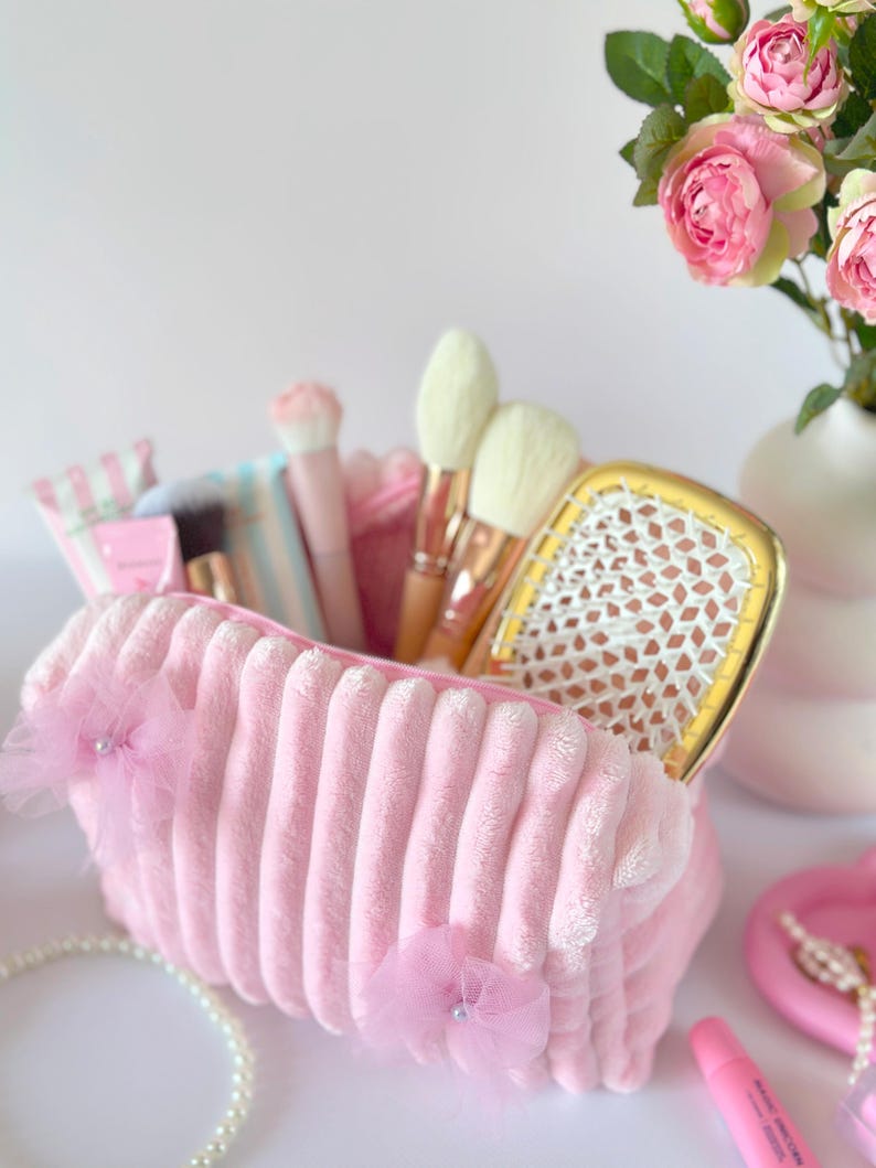 Home Túi mỹ phẩm Túi mỹ phẩm lông mềm hồng pastel nơ tulle