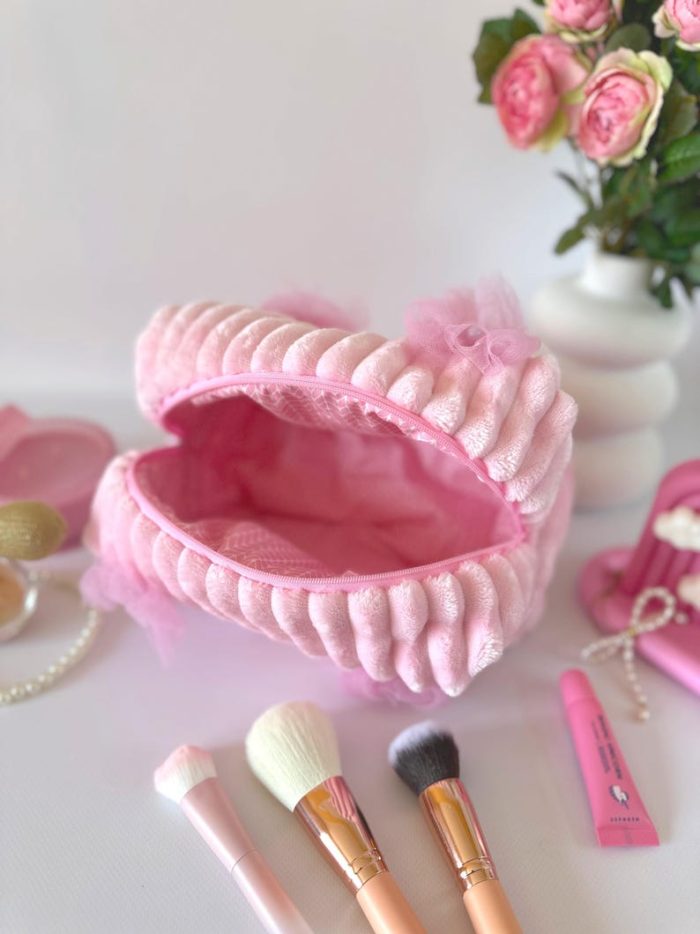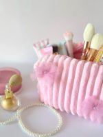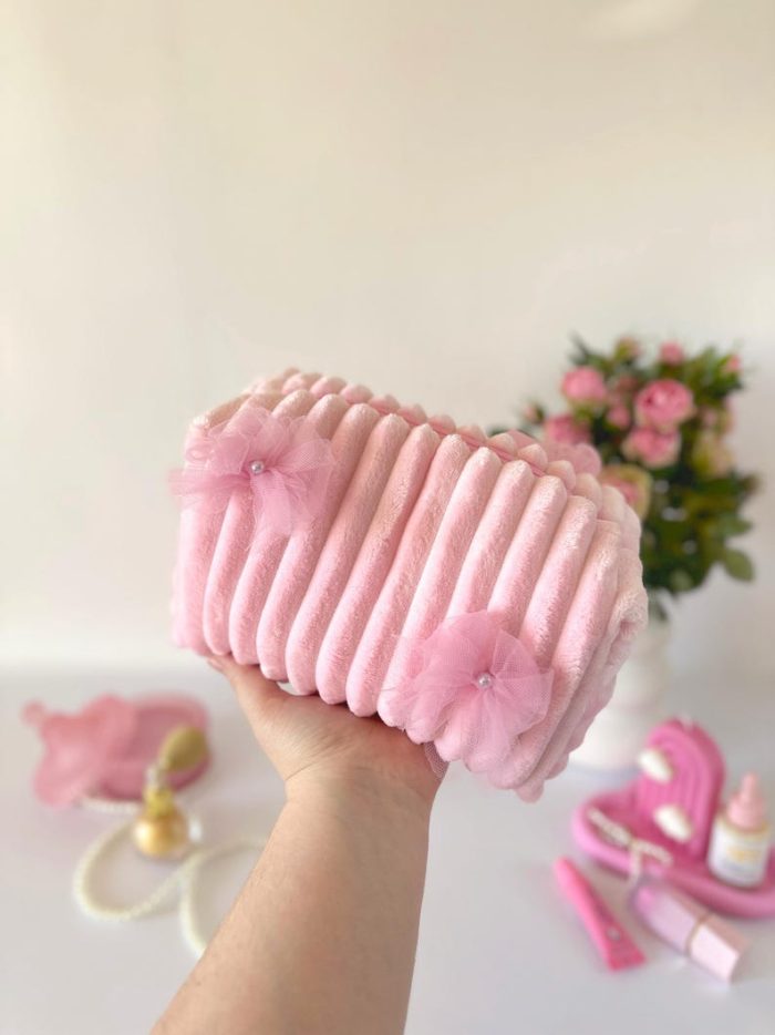 Túi mỹ phẩm lông mềm hồng pastel nơ tulle