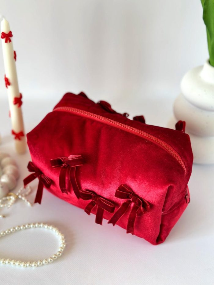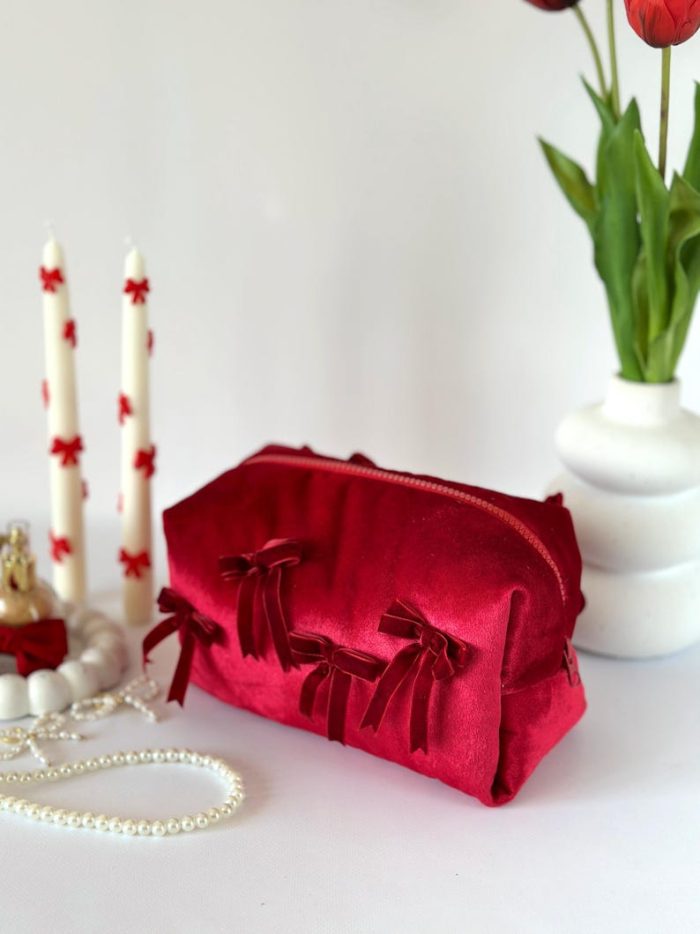 Túi mỹ phẩm nhung đỏ nơ trang trí
