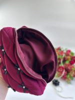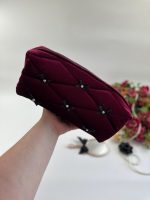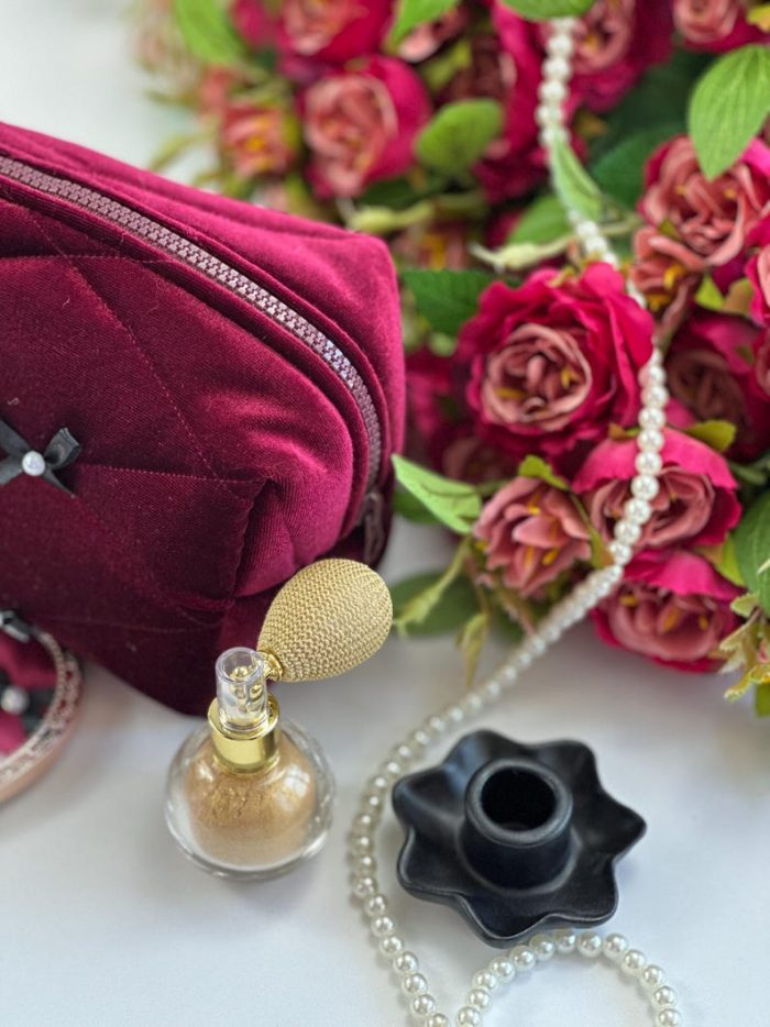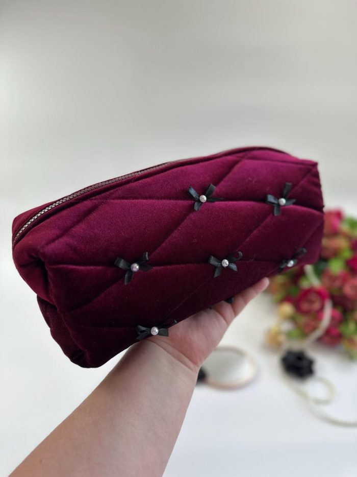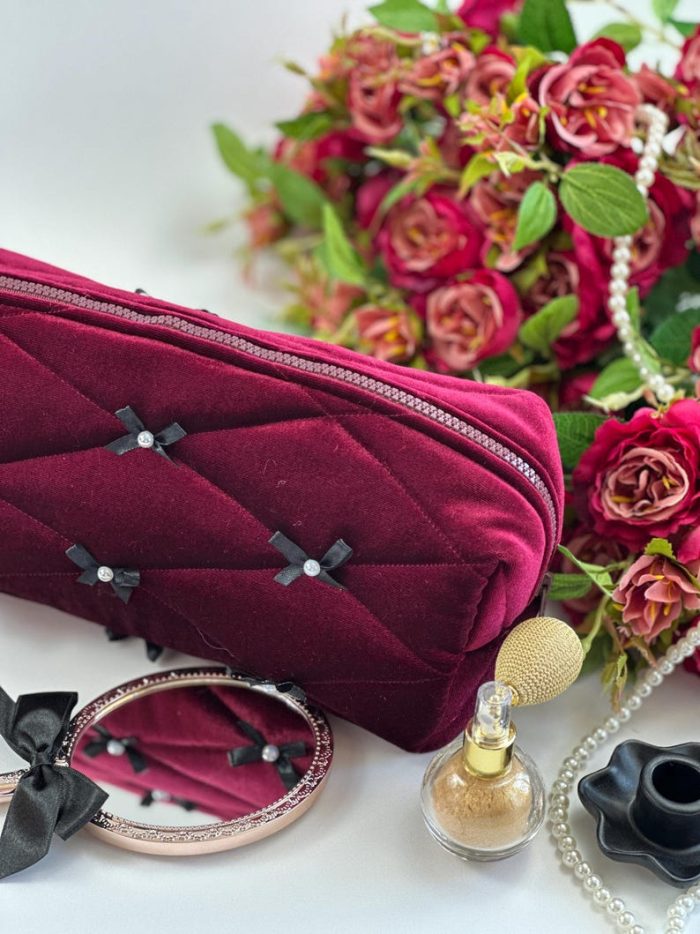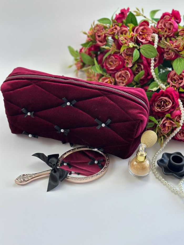 Túi mỹ phẩm nhung đỏ rượu nơ đen