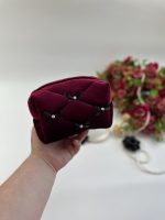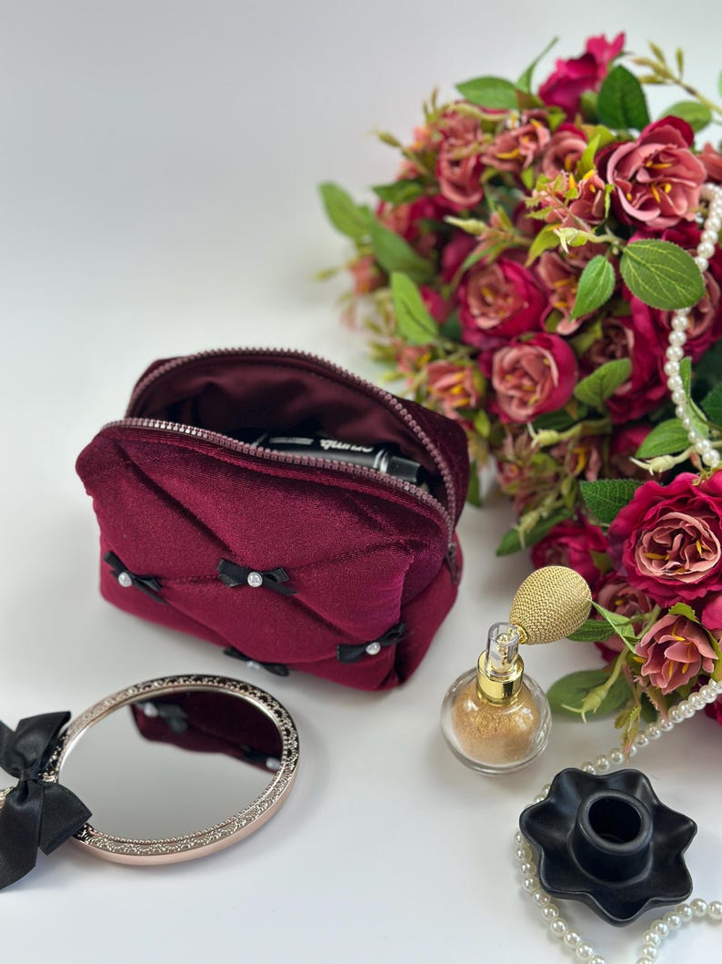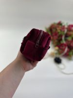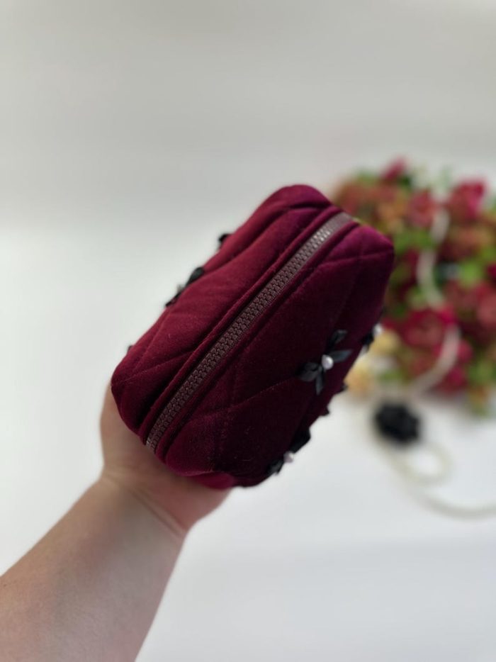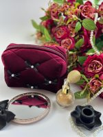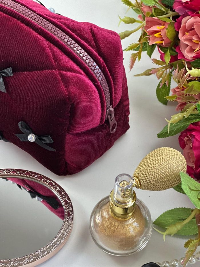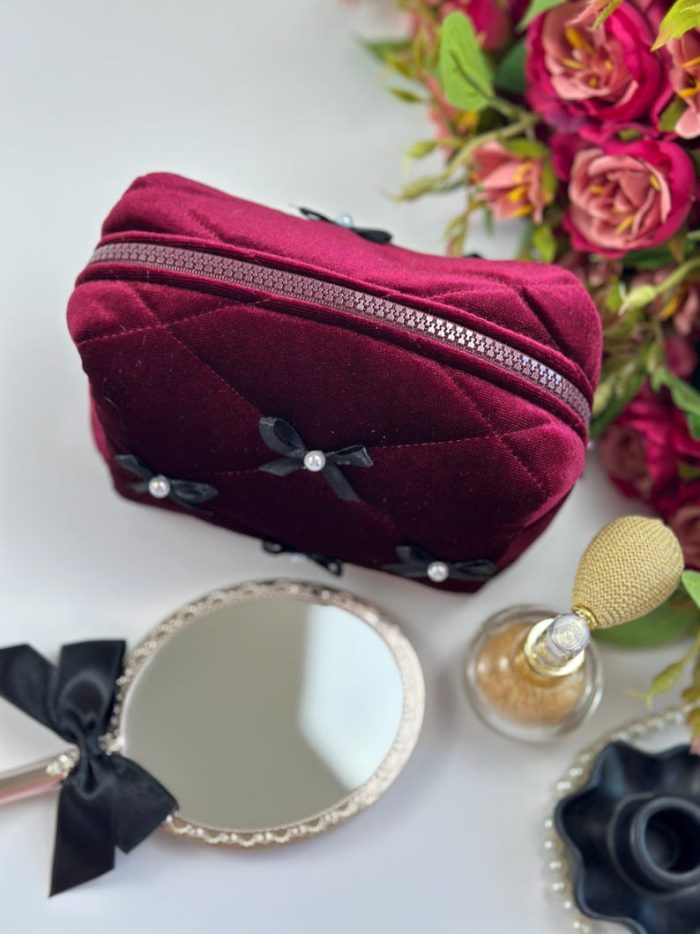 Túi mỹ phẩm nhung đỏ rượu nơ đen