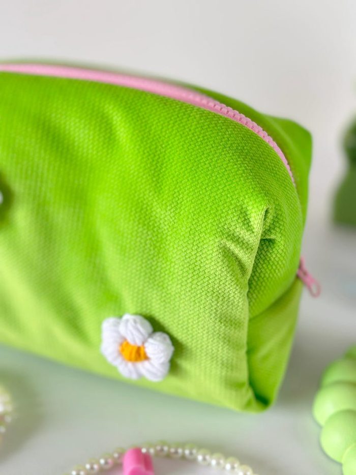 Túi mỹ phẩm nhung hoa cúc 3D xanh lá