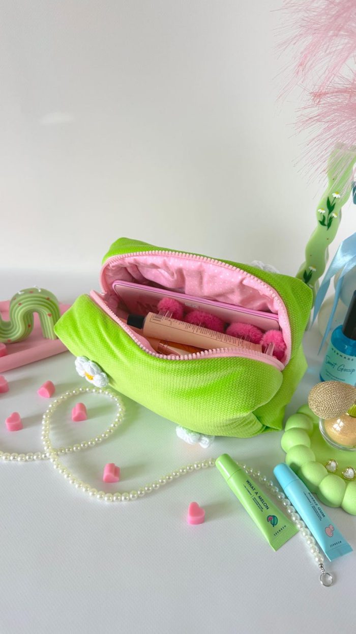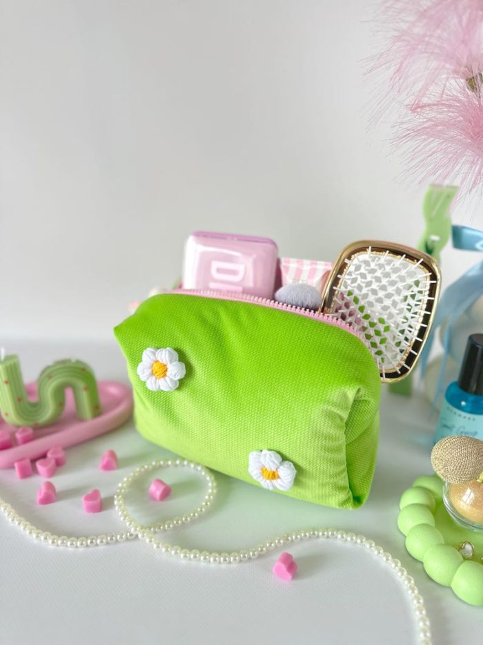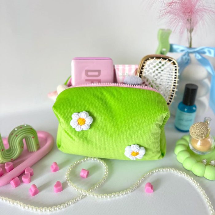 Home Bộ sưu tập Hot Túi mỹ phẩm nhung xanh hoa cúc 3D