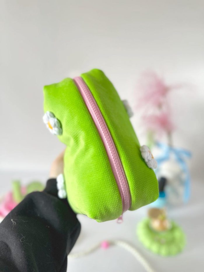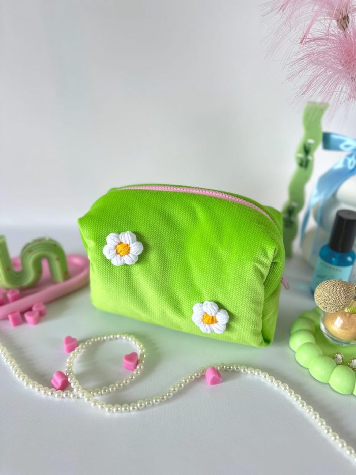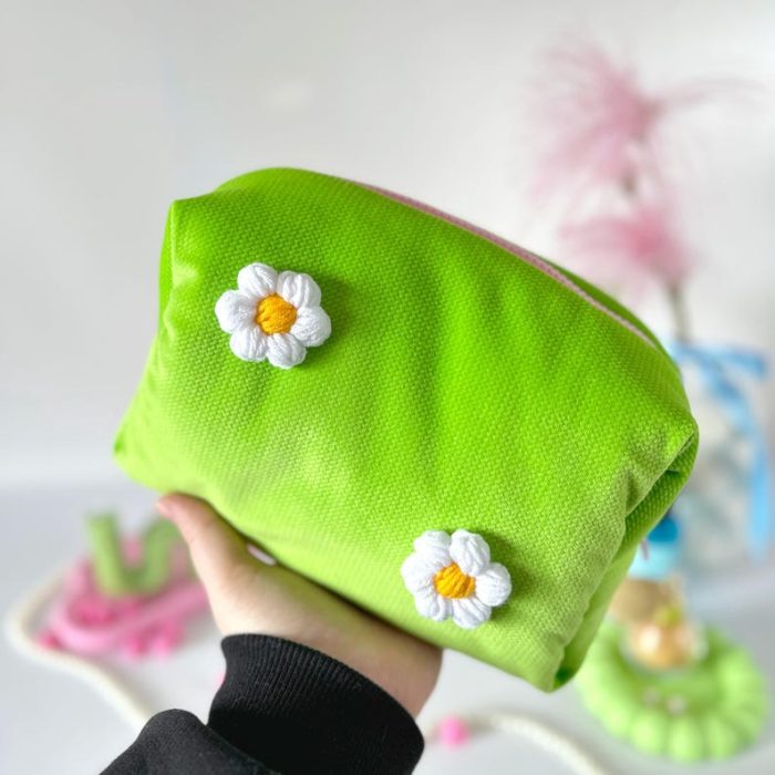 Túi mỹ phẩm nhung xanh hoa cúc 3D