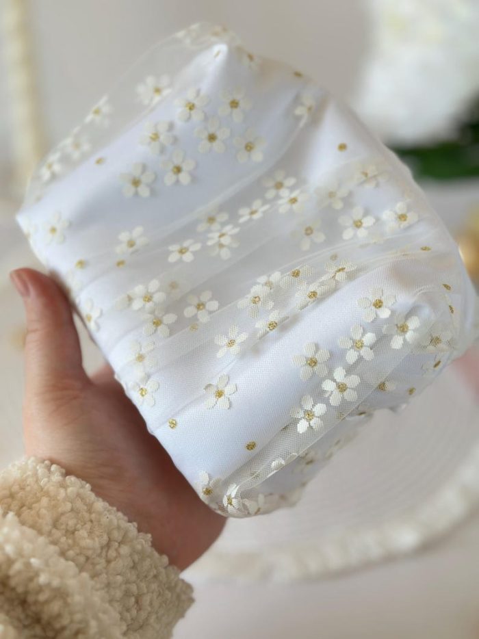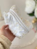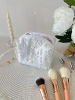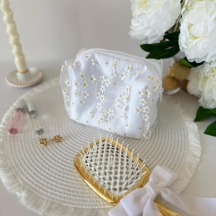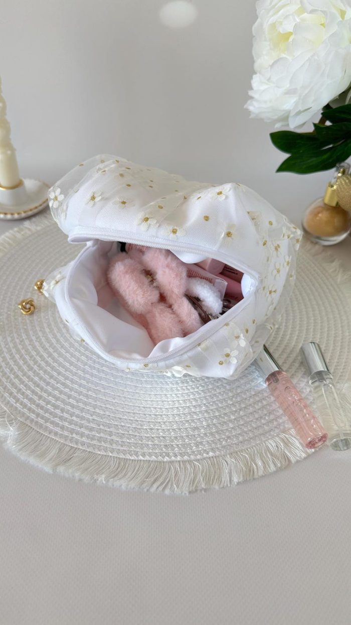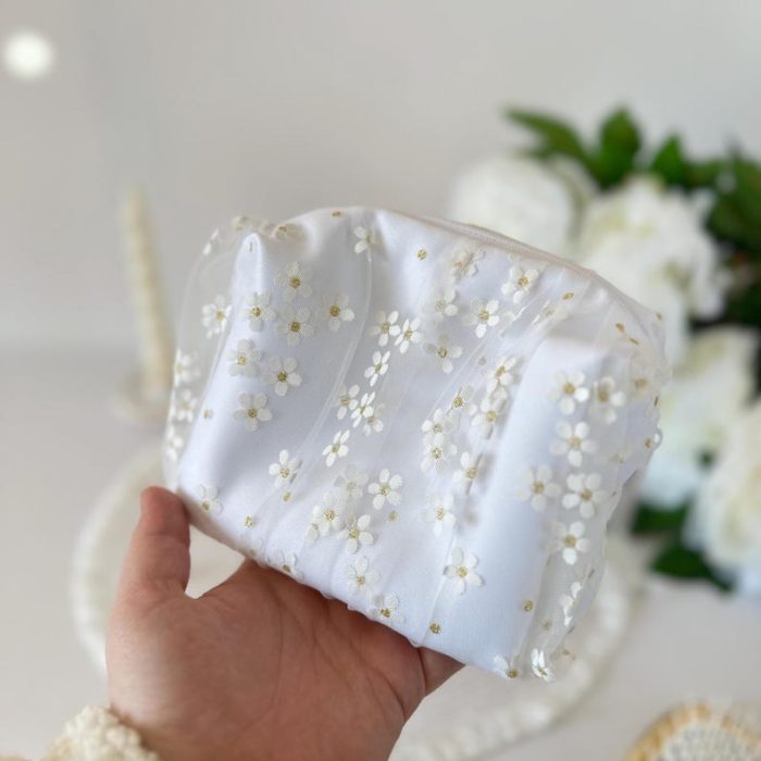 Túi mỹ phẩm satin organza hoa cúc trắng