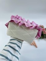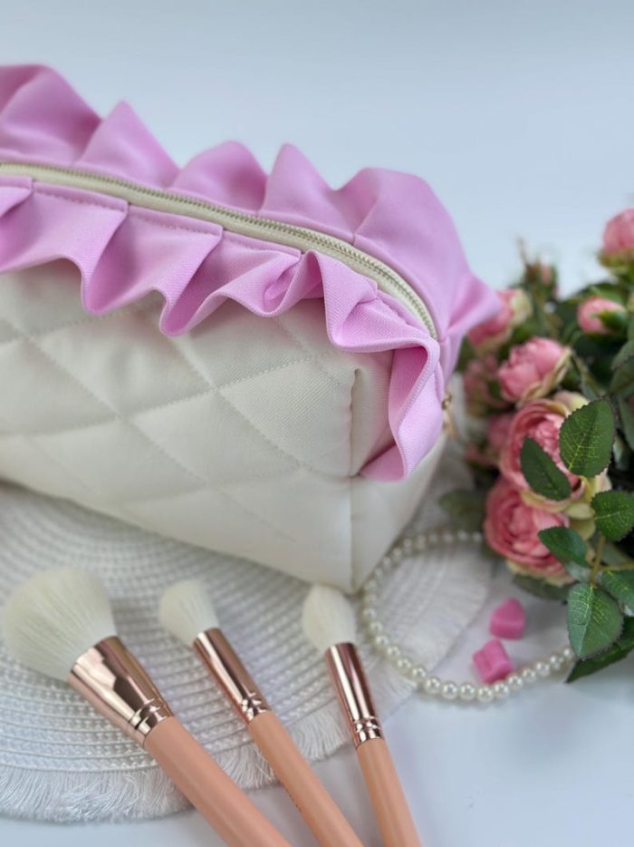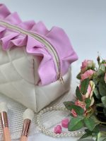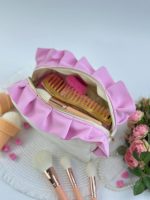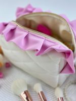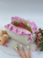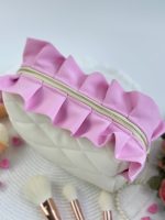 Home Bộ sưu tập Hot Túi mỹ phẩm vải suiting kem viền bèo hồng
