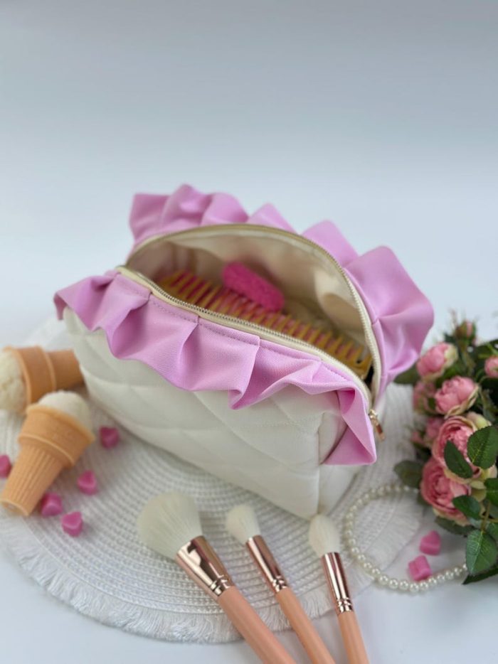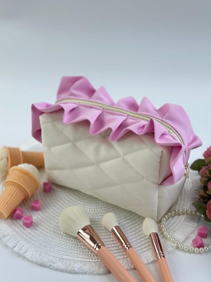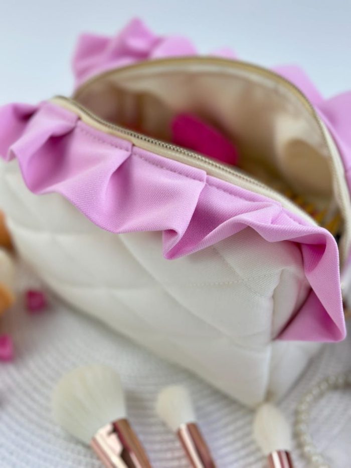 Túi mỹ phẩm vải suiting kem viền bèo hồng